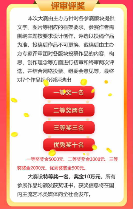 大賽設(shè)特等獎(jiǎng)1個(gè),獎(jiǎng)金10萬元。7個(gè)作品組將分別評(píng)選出一等獎(jiǎng)1個(gè)、二等獎(jiǎng)2個(gè)、三等獎(jiǎng)3個(gè)、優(yōu)秀獎(jiǎng)10個(gè),并頒發(fā)獎(jiǎng)金、證書,獲獎(jiǎng)信息將通過主流媒體刊登。同時(shí),所有獲獎(jiǎng)的優(yōu)秀作品將集中進(jìn)行展示。優(yōu)秀的大學(xué)生們,你還在等什么,趕緊投稿參賽吧!